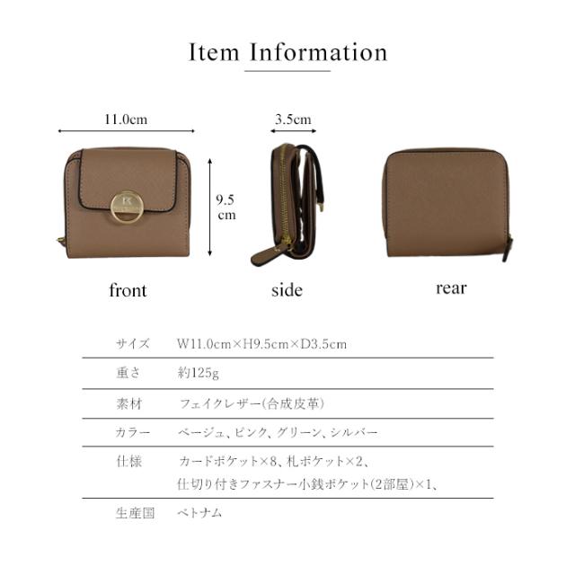 上品な無地のフェイクレザーに、ロゴ入り丸型ボタンが映えるおしゃれなレディース財布です。