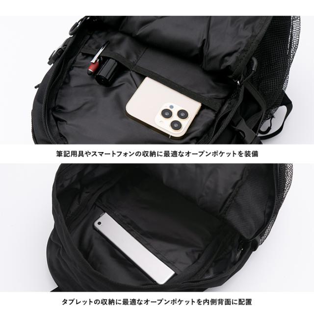 両サイドのメッシュポケットに折り畳み傘やペットボトルをサッと入れられるので、