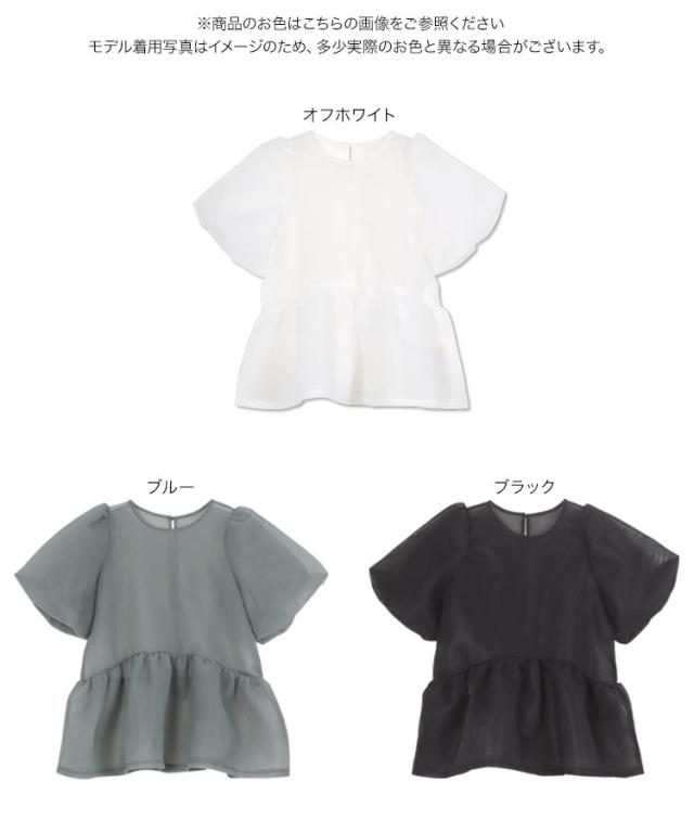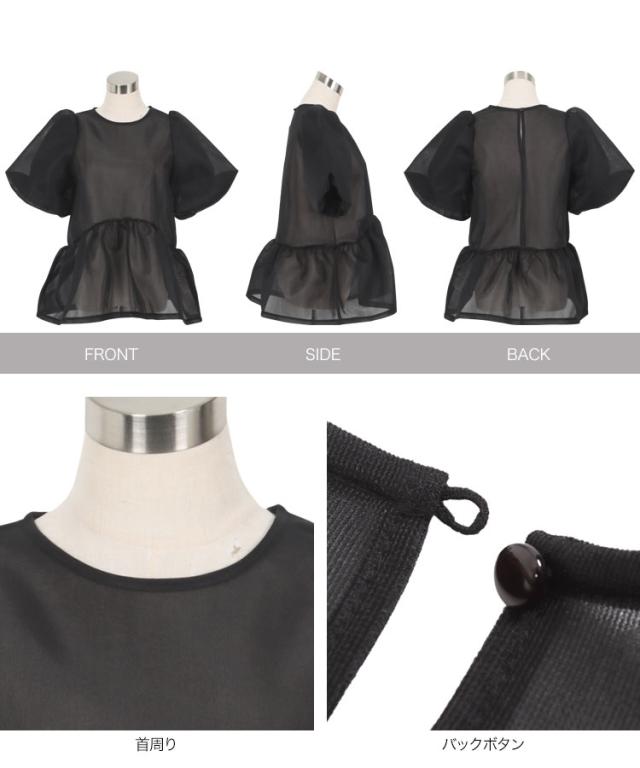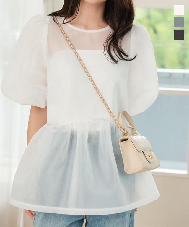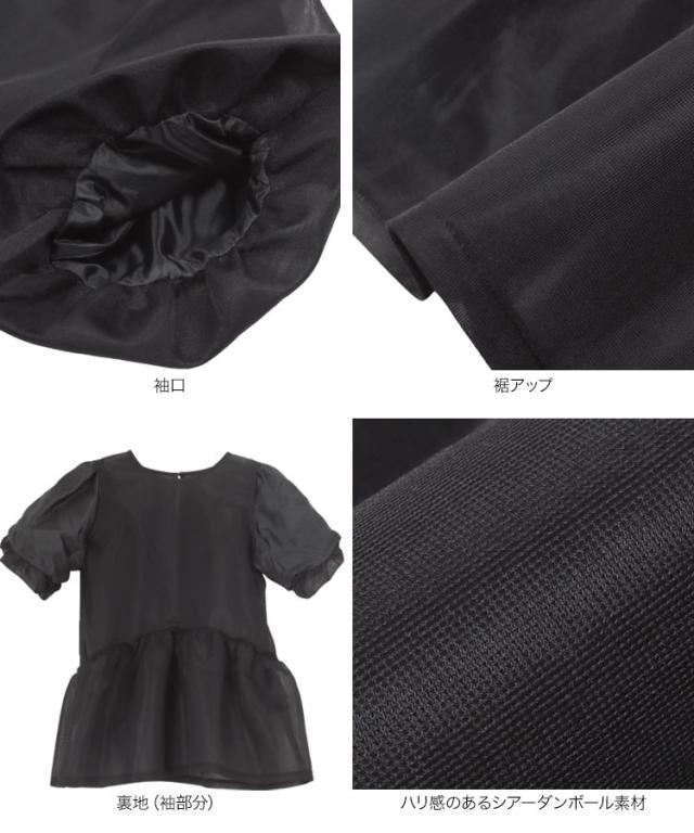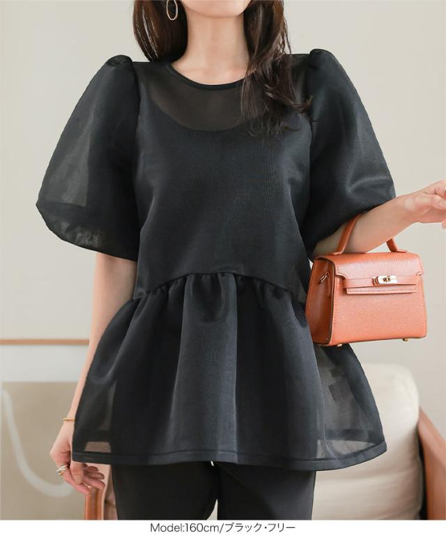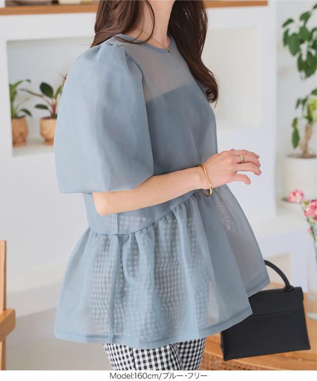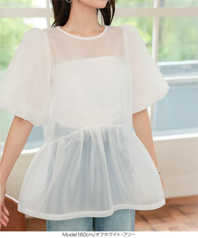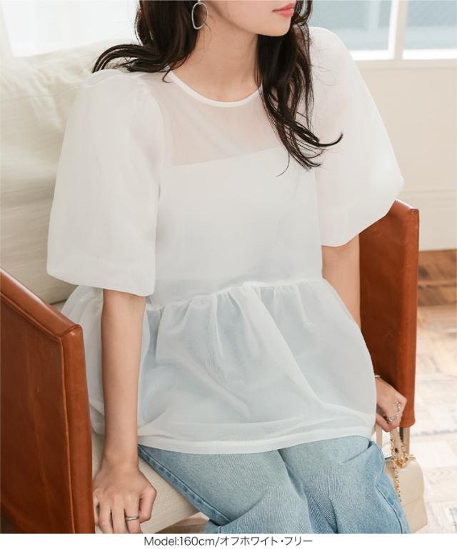 シアーダンボールペプラムトップス C7634 入荷済 レディース 20代 30代 40代 トップス ブラウス 半袖 ペプラム シアー チュニック シアーダンボール ビスチェ ウエスト切替え プルオーバー 透け感 体系カバー パフスリーブ 2way ぽわ