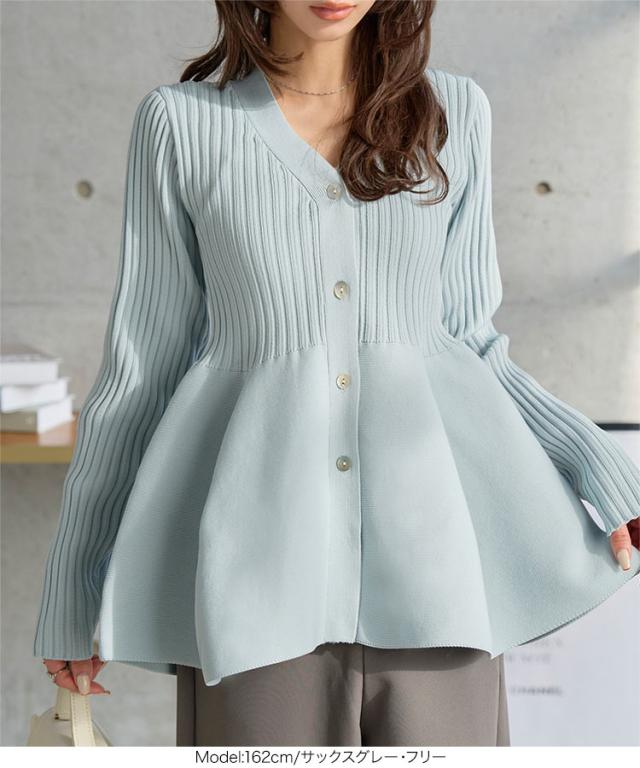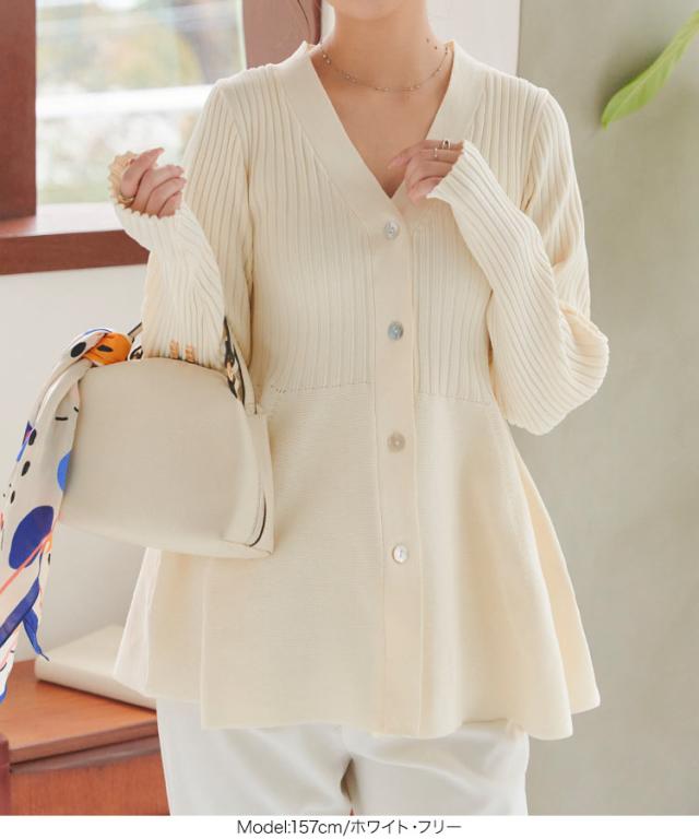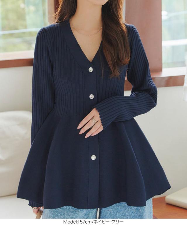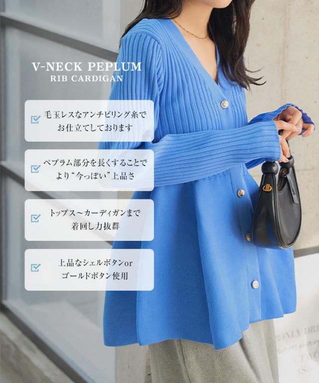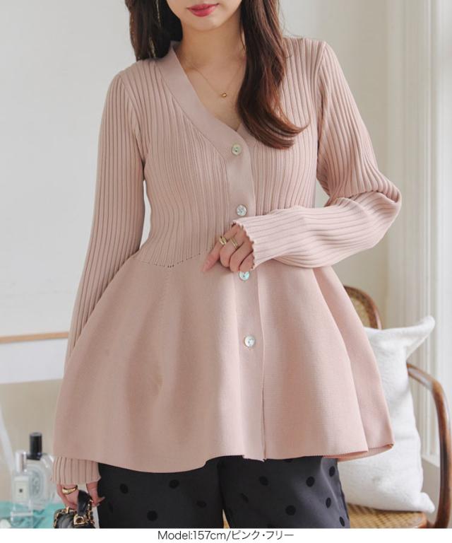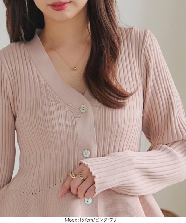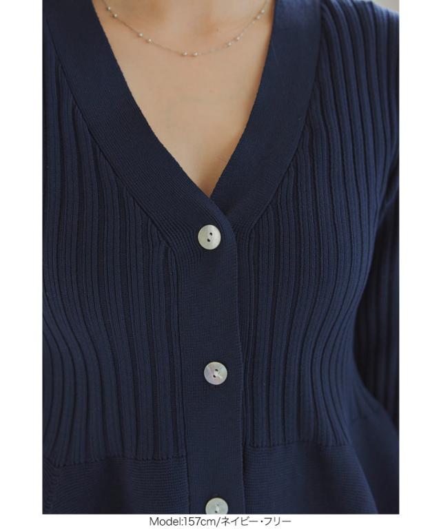 Vネックペプラムリブカーディガン N1155 入荷済 レディース シェルボタン ペプラムニット リブ 長袖 ニット ペプラム ペプラムカーディガン カーデ ニットカーディガン 貝ボタン アンチピリング 2way Vネック セットイン