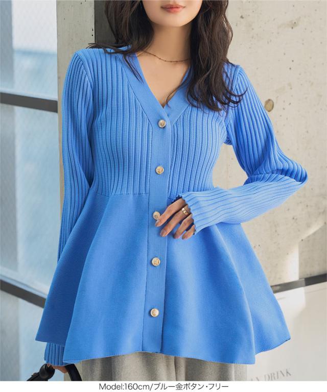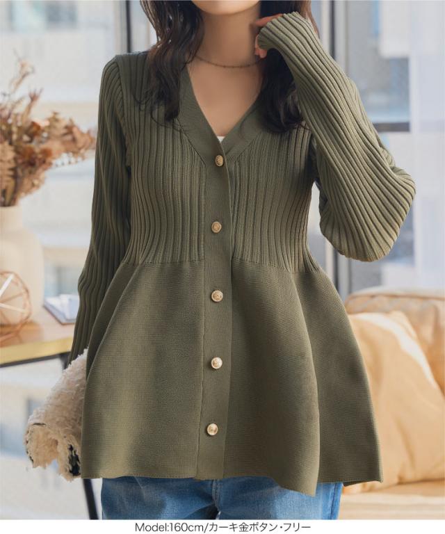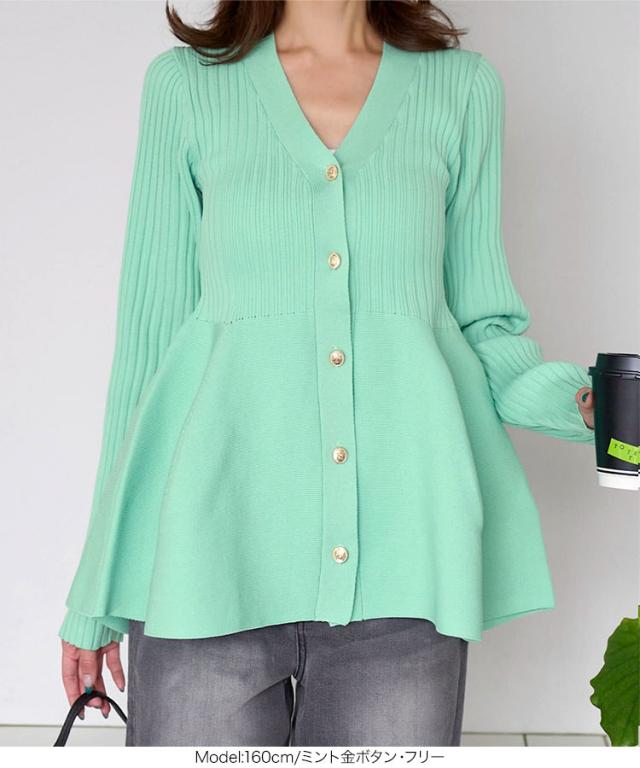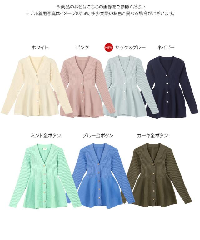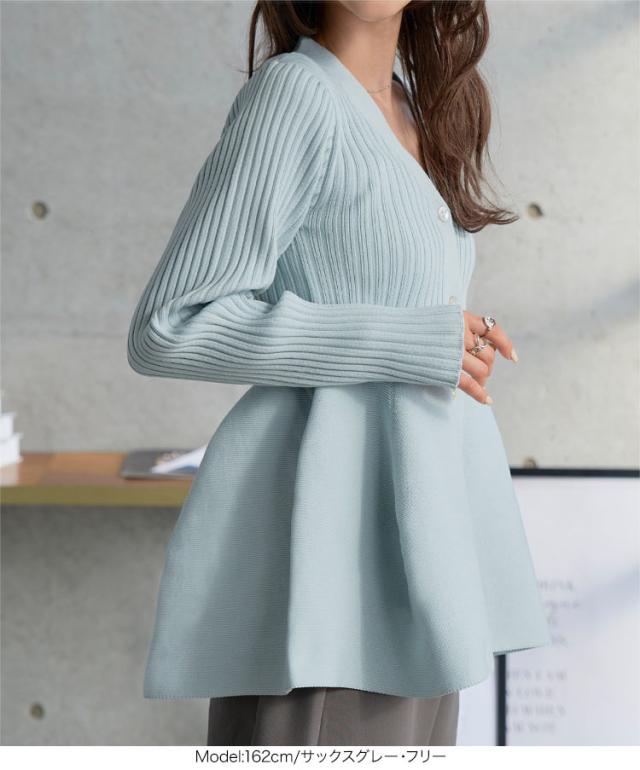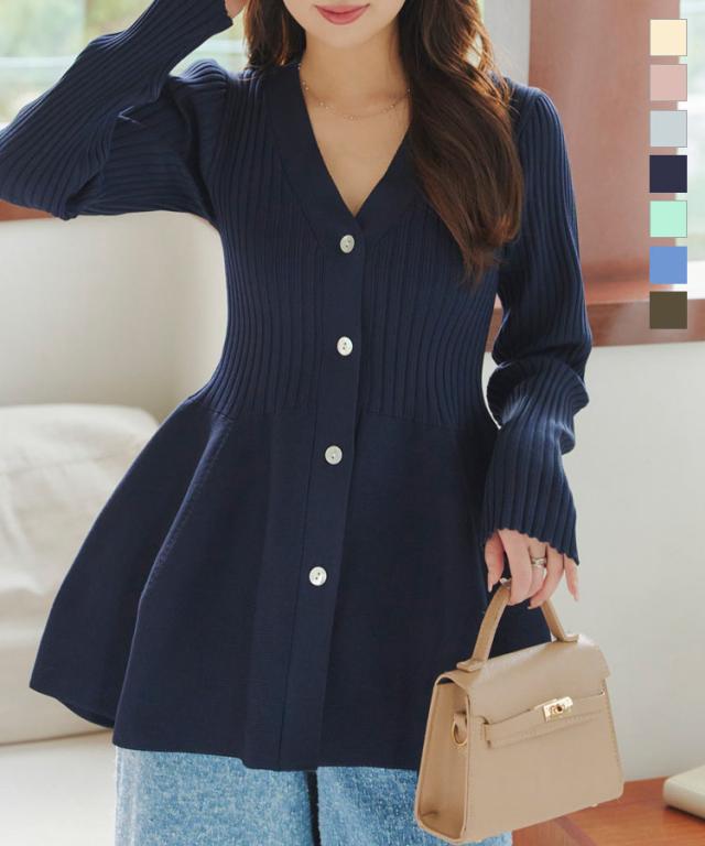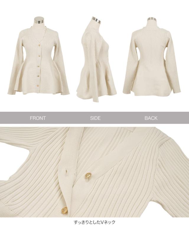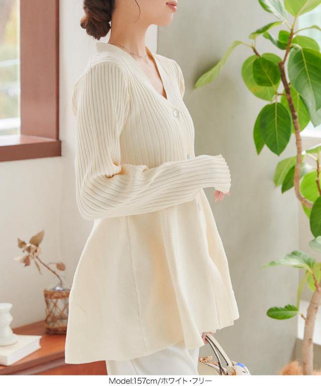 Vネックペプラムリブカーディガン N1155 入荷済 レディース シェルボタン ペプラムニット リブ 長袖 ニット ペプラム ペプラムカーディガン カーデ ニットカーディガン 貝ボタン アンチピリング 2way Vネック セットイン