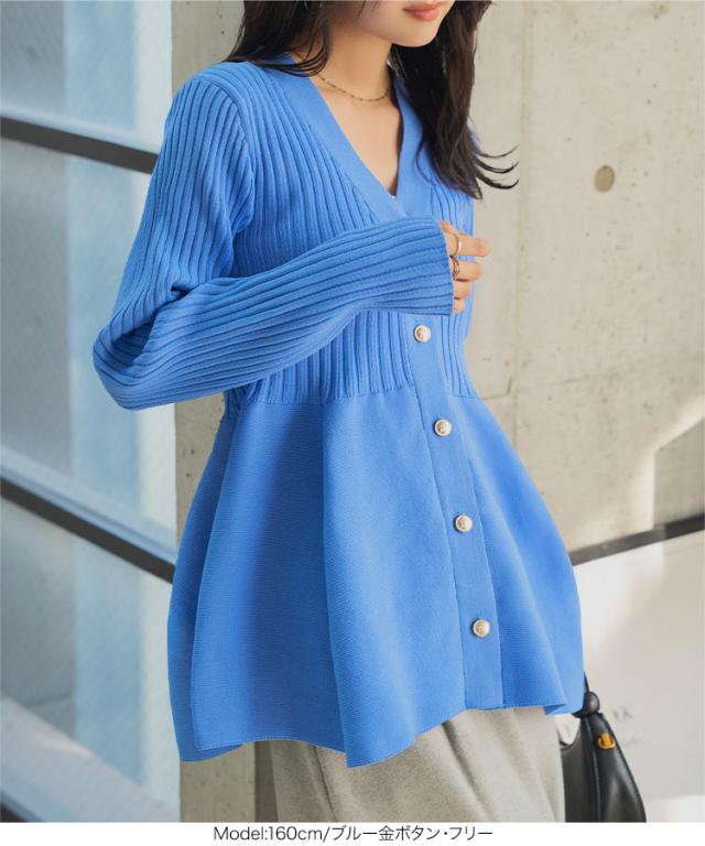 即完売した春夏のシェルボタンVer.から、新しくゴールドボタンにRENEWAL。カラーバリエーションも秋冬に着やすい色味に新しくなりました〇シンプルながらも上品さが際立つVネックペプラムリブカーディガン。裾のペプラムデザインがウエストラインにメリハリを与え、気になるお腹まわりをさりげなくカバーしてくれます。リブ素材ならではの程よいフィット感と、すっきりとしたVネックがデコルテをきれいに見せてくれるのも嬉しいポイント。冷房対策にも最適で、オフィスでの羽織りとしても大活躍◎【素材・サイズ感】毛玉のできにくいアンチピリング糸でお仕立てしているので、お手入れも簡単◎ヒップが隠れるよう後ろだけ長めの着丈にしているので、360度綺麗なシルエット。スラックスやタイトスカートと合わせればきれいめガーリーに、デニムと合わせれば大人カジュアルなデイリースタイルにと、どんなコーディネートにもぴったりフィットします。オンオフ問わず活躍する、スタイルアップ効果抜群の一枚です。※キャンセル/変更不可※※お届けまでの日程について