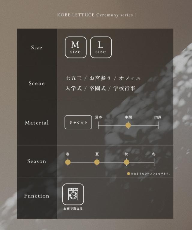 【X490/MLサイズが選べるペプラムジャケット4点スーツ】からジャケット単品Ver.が登場。上下で違うサイズを購入したい方にもおすすめです。上品さの中に女性らしい華やぎを添えるペプラムジャケットは、ウエストをすっきりと引き締め、裾に向かって広がるフレアが柔らかな可愛らしさを演出します。シンプルながらも華やかさがあり、フォーマルシーンはもちろん、デイリーに羽織ってもサマになる万能アイテム。M・Lの2サイズ展開で、自分にぴったりの着心地を選べるのも嬉しいポイントです。【素材・サイズ感】ウエストをすっきりと見せるペプラムシルエットで、メリハリのあるスタイルを叶えるジャケット。肩や腕まわりには程よいゆとりがあり、インナーを重ねても快適に着られます。ヒップにかかる丈感でパンツにもスカートにも合わせやすく、デイリーコーデにも取り入れやすいバランス。セレモニーはもちろん、華やかさをプラスしたい特別なシーンにもぴったりの一着です。※キャンセル/変更不可※※お届けまでの日程について