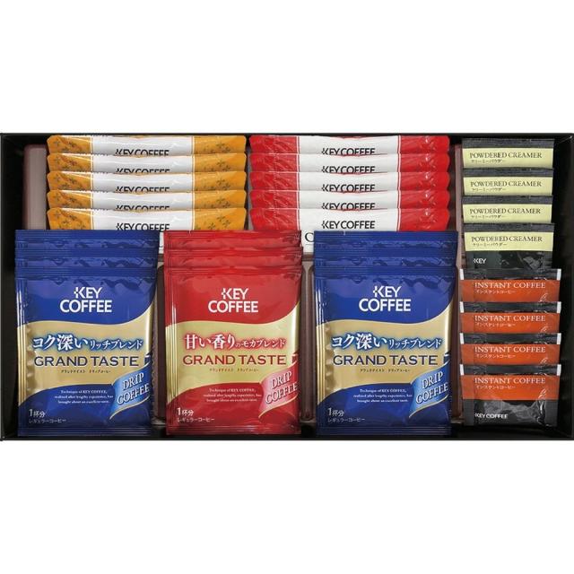 【セット内容】ドリップコーヒー リッチブレンド ×6、スティックコーヒー カフェモカ 7.8g ・スティックコーヒー カフェオレ 7g ×各5、クリーミーパウダー 2.5g ・インスタントコーヒー 2g ×各4、ドリップコーヒー モカブレンド ×3