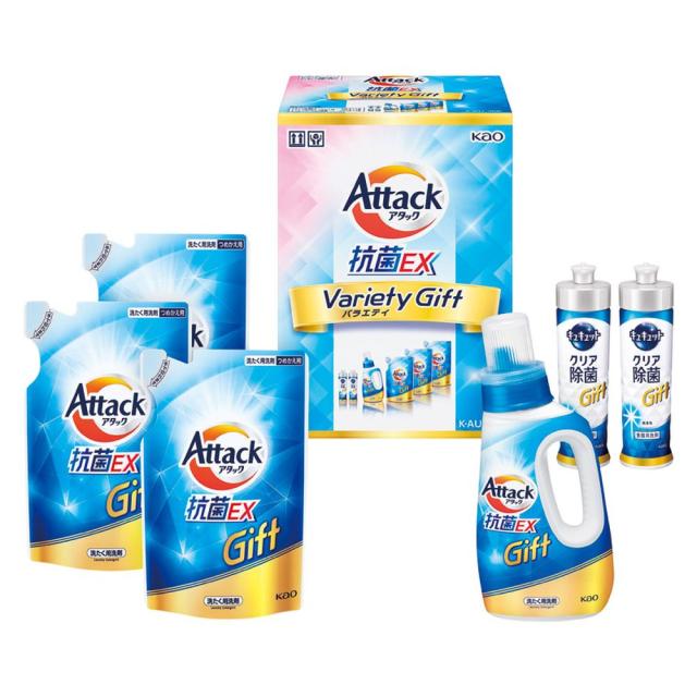 【商品名】 アタック抗菌EXバラエティギフト 【内容】アタック抗菌EX詰替用 590g ×3、キュキュットクリア除菌 220ml ×2、アタック抗菌EX 750g ×1