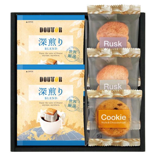 【商品名】 ドトールコーヒー&スイーツセレクション 【内容】ドトールドリップコーヒー 7g ×2、ラスク シュガー・ココナッツ ・ナッツとチョコのざっくりクッキー×各1 【賞味期限】常温6ヶ月 (表示期限の半分以上) 【アレルゲン】卵・乳・小麦 【注釈】※デザイン・内容等が変更になる場合がございます。