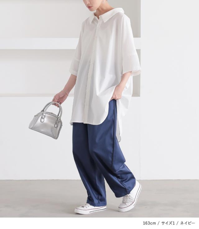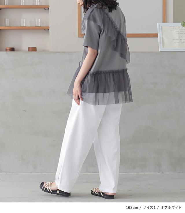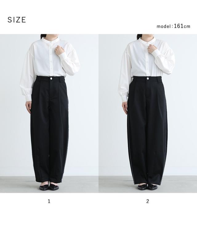 | staff:A/156.5cm B104 W82 H103 【普段着用】 Tops: L/LL Bottoms: L/LL | 【2】 着丈(ウエスト穿き):かかとから5cm余る位 ウエスト:ジャスト ヒップ:ジャスト 太もも周り:ややゆったり 全体:ややゆったり ウエスト以外はゆったりとしたシルエットで着られました。 私の場合は、2を選びます。 |