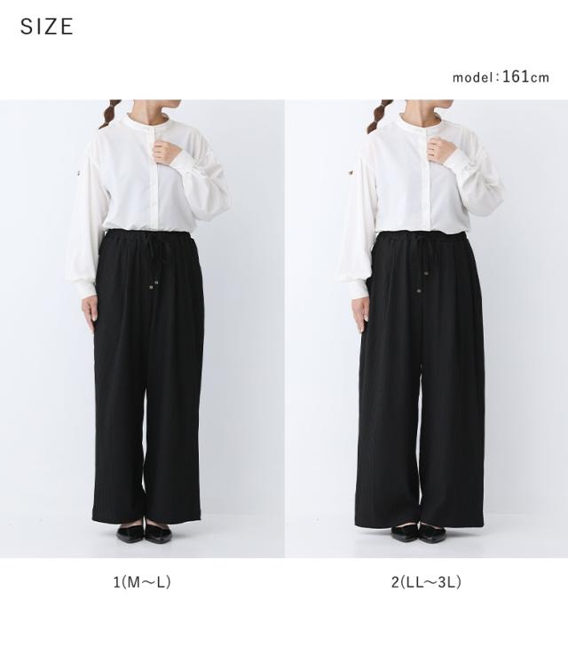 | staff:C/158cm B87 W70 H92.5 【普段着用】 トップス: M ボトムス: M | 【1(M〜L)】 ◆着丈:ウエストで穿いてかかと上位、腰で穿いて地面につく位 【2(LL〜3L)】 ◆着丈:ウエストで穿いてかかと位、腰で穿いて地面につく位 1(M〜L)は全体的にジャストサイズですっきりとしたシルエットで穿けました。ウエスト部分はゴムなので窮屈感はありませんでした。ヒップラインが出るので長めのトップスと合わせるのがお勧めです♪2(LL〜3L)は全体的にゆったりと体のラインを拾わずに穿けました。ウエスト部分は大きめですが、紐で調整できるので問題ありませんでした。 |