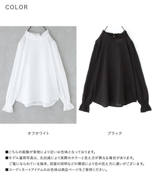 レディース トップス ブラウス シャツ プルオーバー ハイネック スタンドネック 立ち襟 フリル襟 長袖 パフスリーブ ぽわん袖 バルーン袖 ボリューム袖 袖コンシャス フリル袖 シャーリング 涙開き ギャザー ヨーク ストライプ柄 織り柄 無地 綿100% コットン100% ドビー シアー 透け感 レイヤード 重ね着 おうちで洗える 秋冬春 カジュアル レトロ クラシカル シンプル ナチュラル 大人女子 大人可愛い お洒落可愛い ニュアンス Mサイズ Lサイズ LLサイズ 3Lサイズ ぽっちゃり 体型カバー 大きいサイズ 10代 20代 30代 40代 50代 60代 n'OrLABEL ノア—ルレーベル ホワイト 白 オフホワイト ブラック 黒 春秋冬 スタンドカラー シャーリング袖 ドビー織 メロー sheertops[ID]tkn0477[n'OrLABELドビーストライプフリルブラウス]