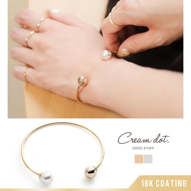 メタルスフィア&パールが艶めくオープンバングル。クールな印象のスフィアにパールを組み合わせて女性らしい柔らかな印象をプラス。シンプルコーデに取り入れて大人っぽさアップ◎