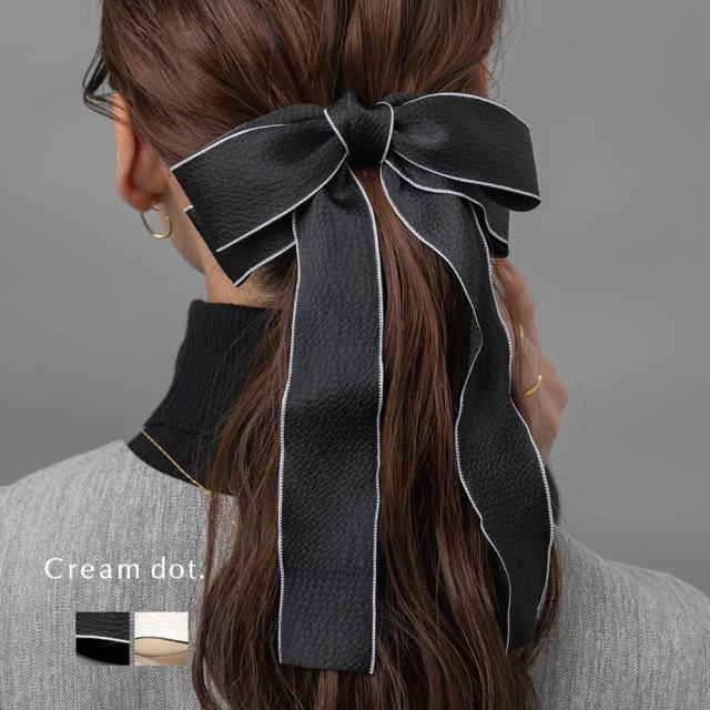 モノトーンのリボンを、バイカラーの縁どりで引き締めたデザイン。後ろ姿を簡単に華やかに魅せてくれ、コーデをグッと格上げしてくれます。