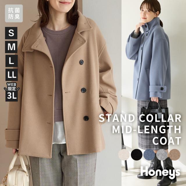 アウター コート ハーフ丈コート 抗菌防臭 静電気軽減 大きいサイズ スタンドネック 再生ポリエステル レディース SALE セール Honeys ハニーズ スタンドハーフ丈コート