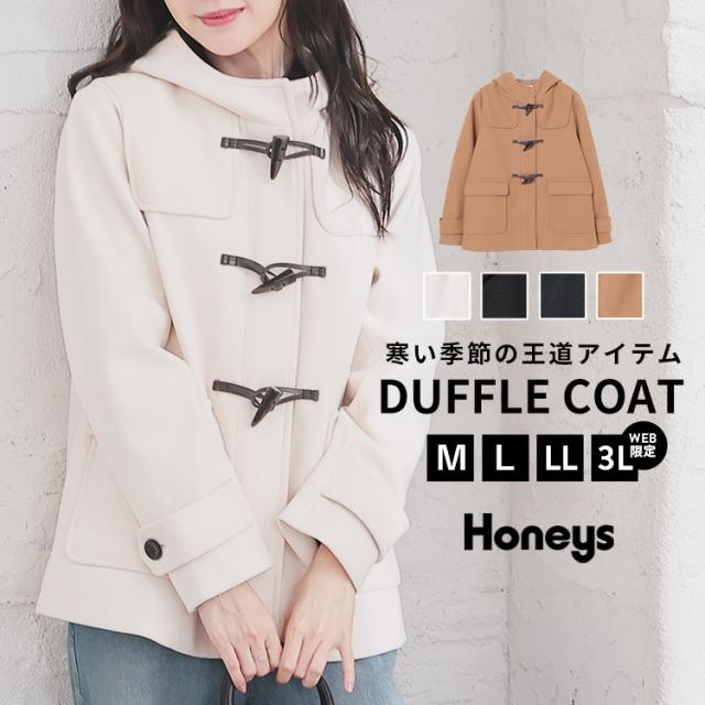 アウター コート 大きいサイズ 再生ポリエステル フェイクウール フード付き 裏地付き 無地 ガーリー 冬 レディース SALE セール Honeys ハニーズ ダッフルコート