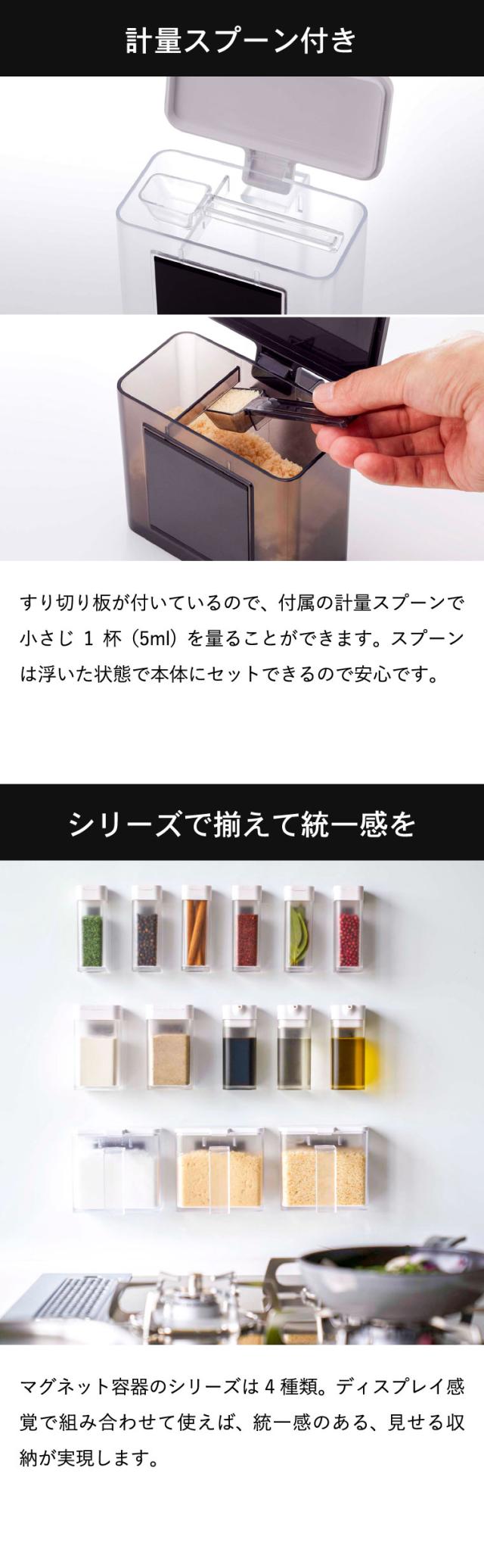 ●素材・材質:容器・スプーン・蓋・すり切り板:ポリスチレン樹脂 マグネット 滑り止め:シリコーン