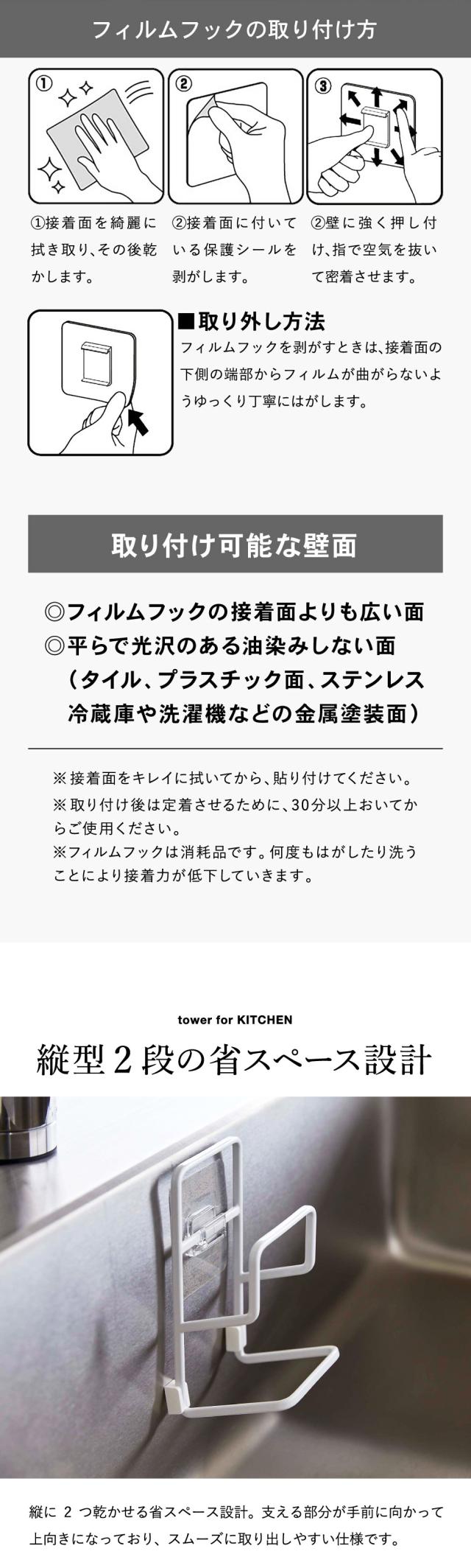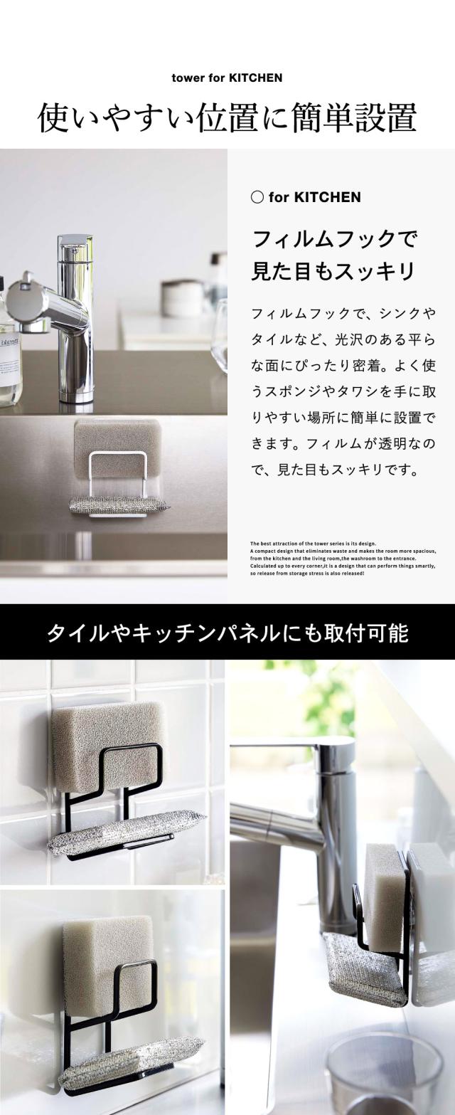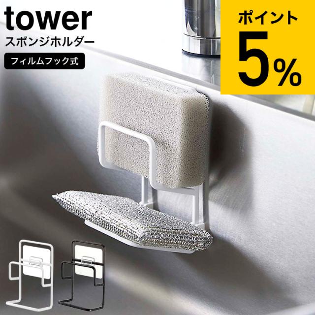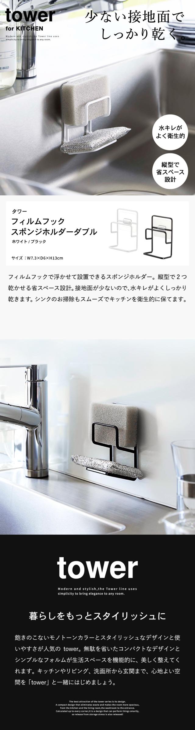 tower 山崎実業 フィルムフックスポンジホルダー タワー ダブル ホワイト ブラック 7017 7018 スポンジホルダー スポンジラック シンク タイル キッチンパネル 取り付け 2段 縦型 スポンジ ブラシ 2個 収納 タワーシリーズ