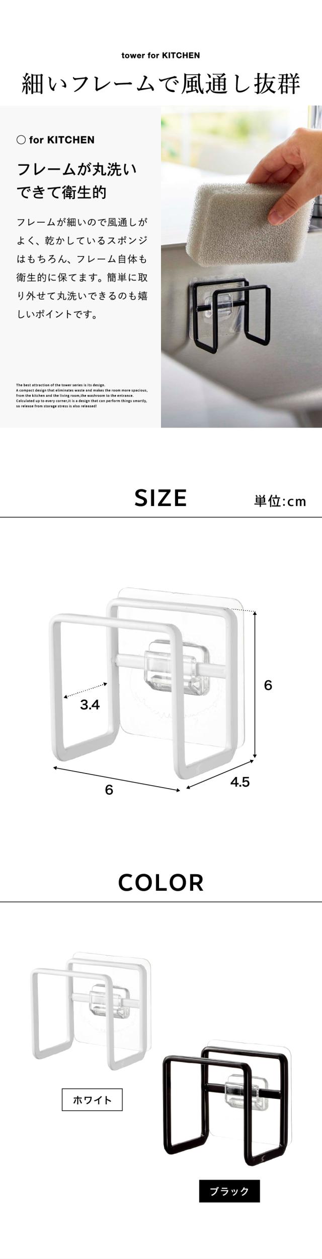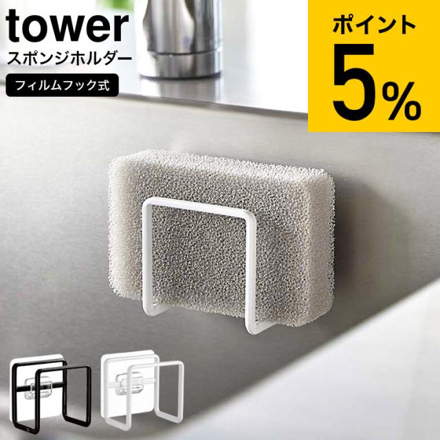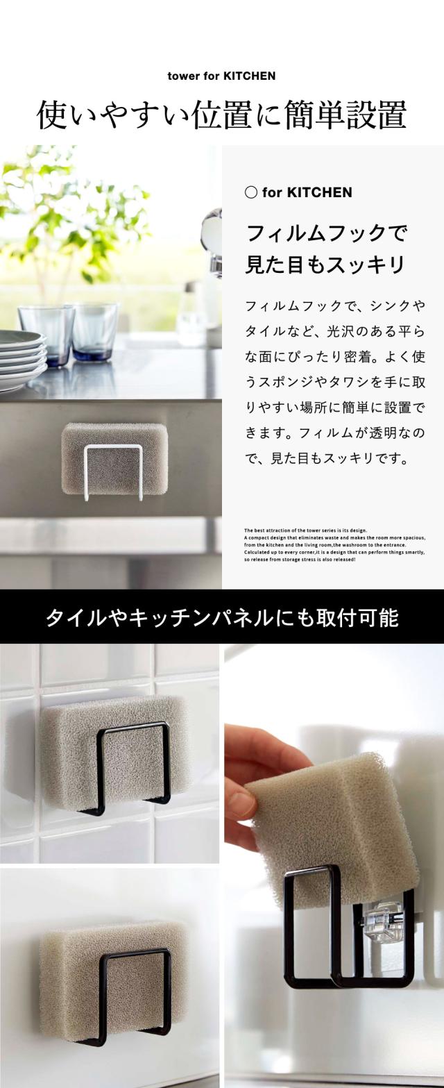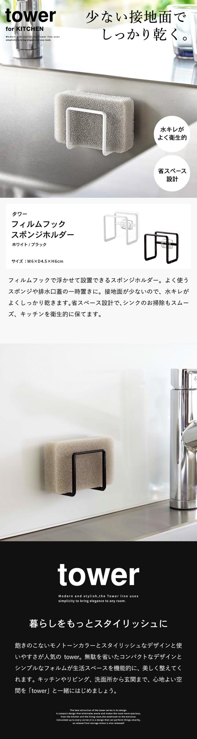 tower 山崎実業 フィルムフックスポンジホルダー タワーホワイト ブラック 6621 6622 スポンジホルダー スポンジラック シンク タイル キッチンパネル 取り付け スポンジ 収納 省スペース フィルムフック タワーシリーズ
