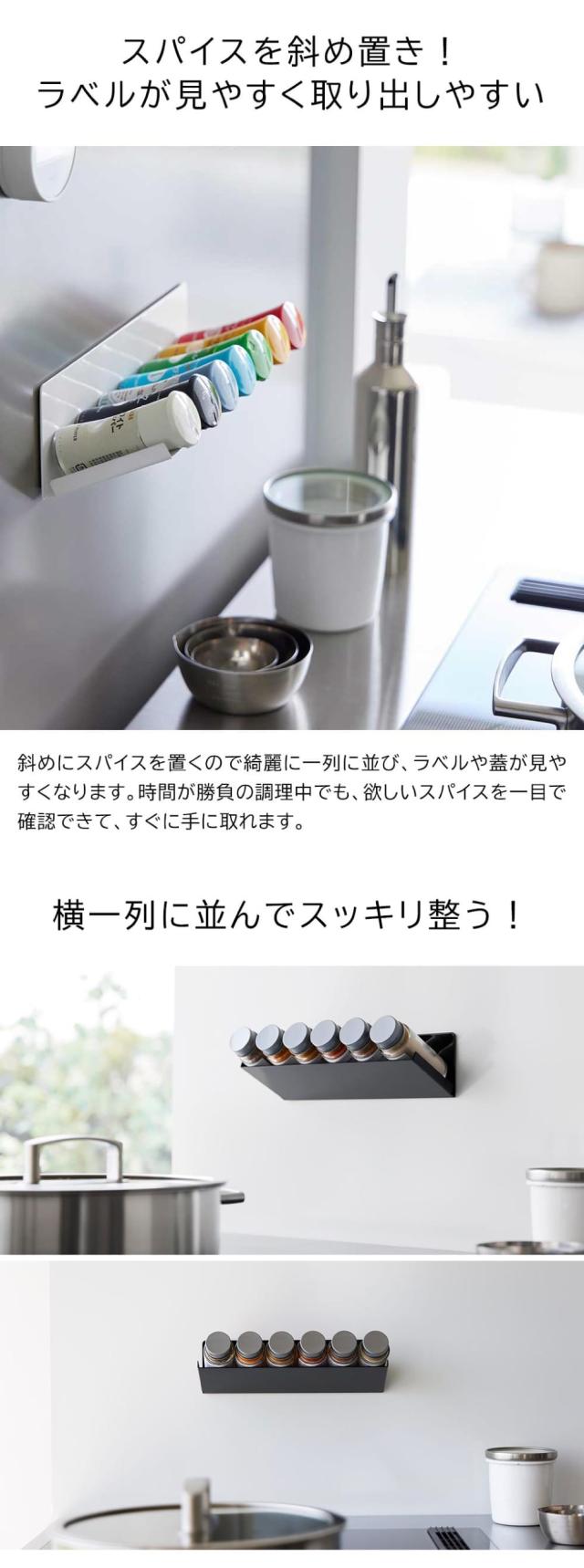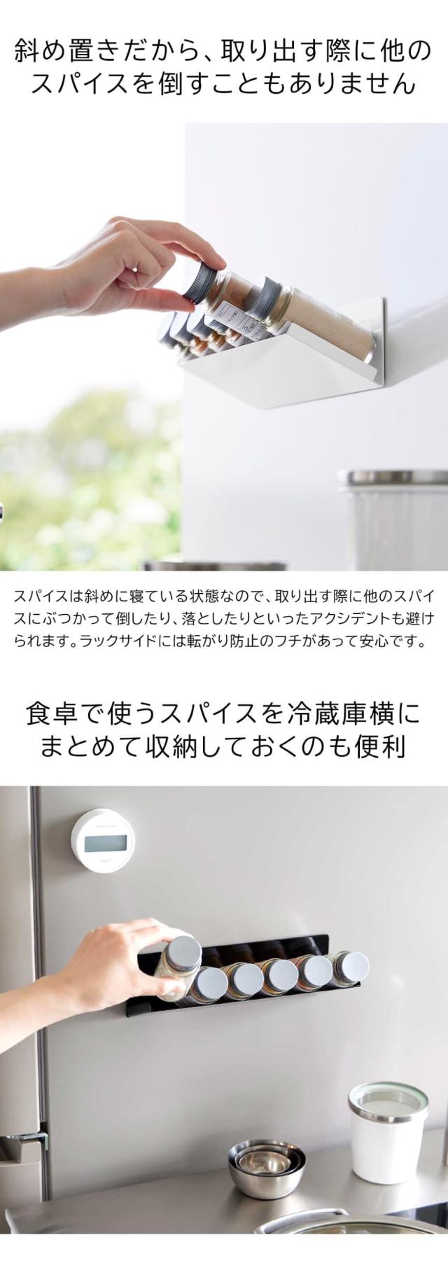 マグネットで簡単に取り付けられる斜め置きのスパイスラックです。マグネットのつくキッチンパネルや冷蔵庫にペタッとくっつけるだけで設置可能。両サイドにはフチが付いているので転がり落ちることがありません。斜めに収納することで一列にキレイに並び、ラベルも見やすいので、目的のスパイスのみサッと取ることができます。食卓でよく使用するスパイスを収納しておけば、家族の中で気付いた人や使う人が準備できるので便利です。
