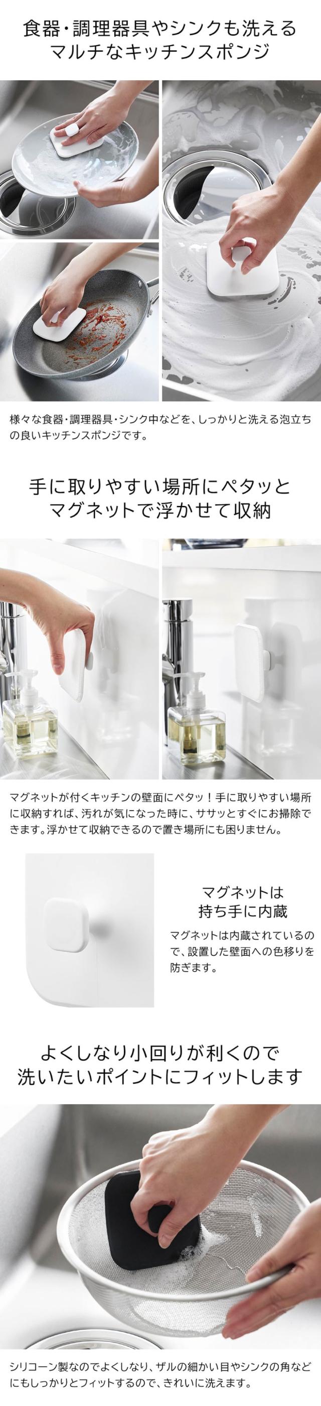 マグネットが付く壁面に簡単設置!柔らかくしなるシリコーン製のキッチンスポンジ。目の細かいザルやシンクの角にもしっかりフィットし、泡立ちも良いのできれいに洗えます。