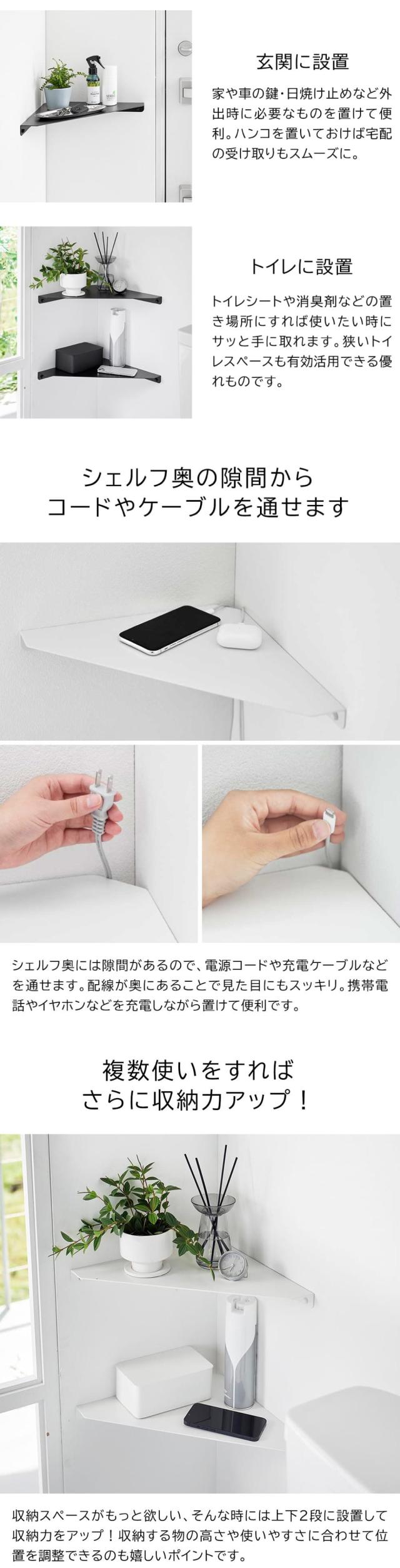 石こうボードピンで簡単取り付け!棚が欲しい場所に設置可能なワイドなコーナーシェルフ。シンプルなデザインなので、お部屋に圧迫感を与えず設置できます。ベッドサイドでは置き場所に困るスマートフォンやメガネ置きに便利です。玄関に設置して鍵や芳香剤などの小物置きに。トイレではお掃除シートや消臭スプレーなどの小物置きとしても。用途に合わせて2段使いもおすすめです。※本製品を2個使用した場合や「石こうボード壁対応 コーナーシェルフ タワー」(品番6911/6912)を使用した場合(別売)。背面から充電ケーブルや電源コードを通すことがでるので便利です。壁の穴が目立たず取り付けることができる石こうボードピン付き。(木ネジでも取り付け可能)