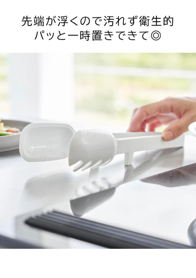 熱にも強く、食器や調理器具を傷つけにくいシリコーンの調理トングです。これ一本でトングとスプーンの2つの機能を併せ持っているので、洗い物も減らせて便利。持ち手が太めで握りやすく、滑りやすい麺類もしっかりつかめます。片面がスプーン形状なので、フライパンのソースやサラダのドレッシングなどをすくってかけられます。柄の部分に脚が付いており、トングを置くと先端が浮くので汚れず衛生的です。