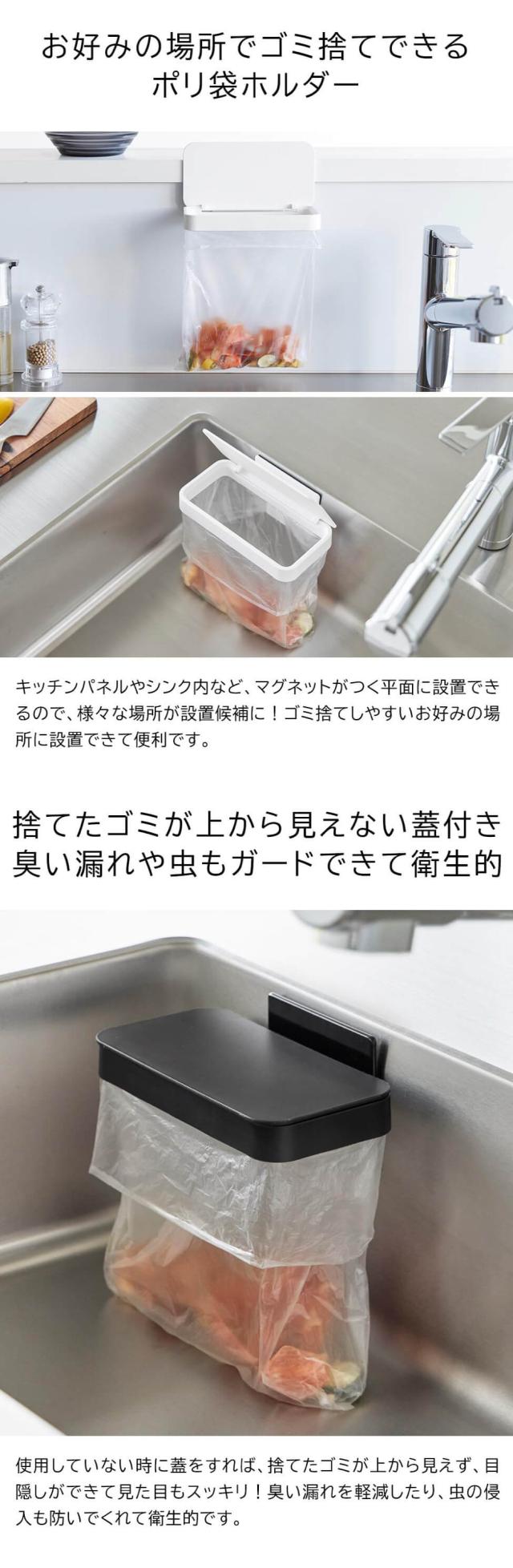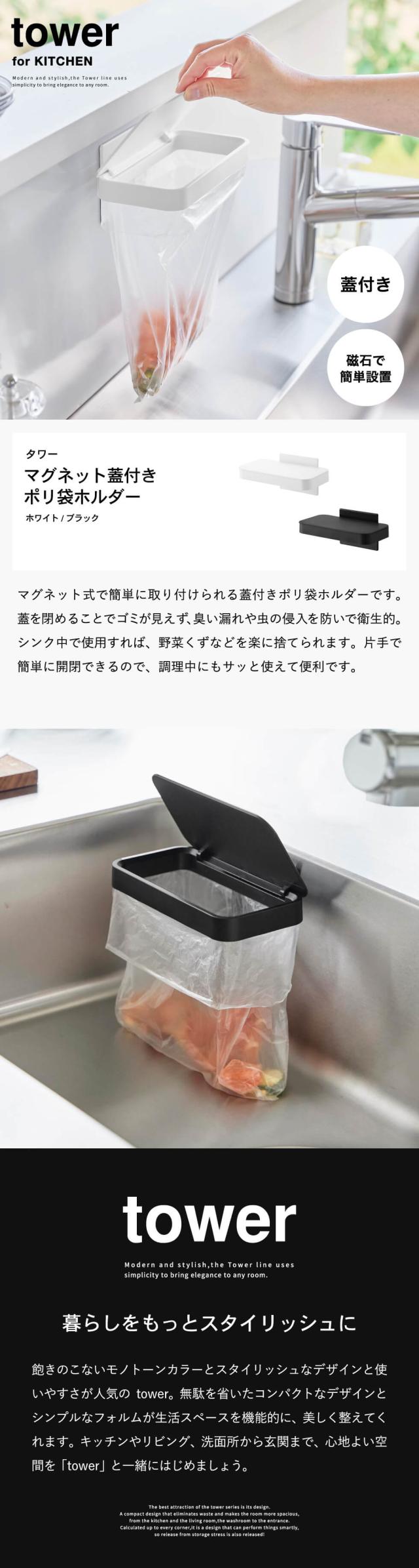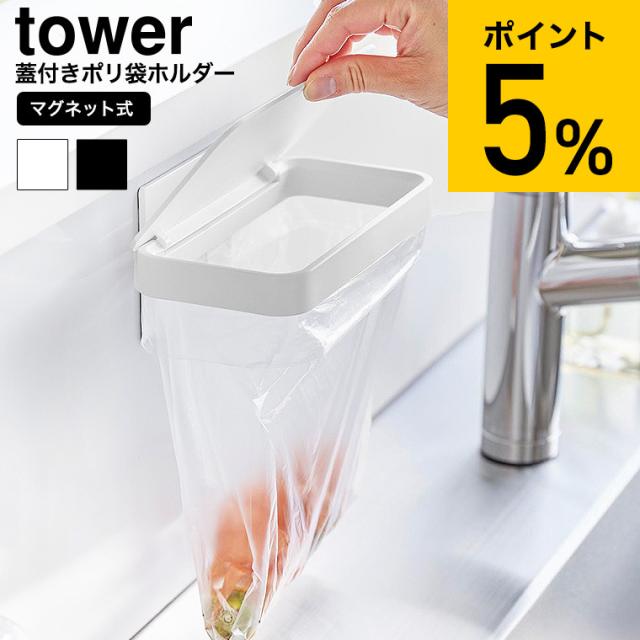 山崎実業 tower マグネット蓋付きポリ袋ホルダー タワー 公式 1919 1920 ホワイト ブラック 三角コーナー 生ごみ 生ゴミ入れ ゴミ箱 水切り袋 ゴミ袋ホルダー シンク内 キッチンパネル タイル シンク扉