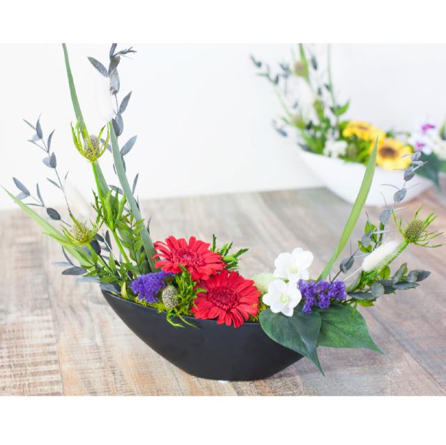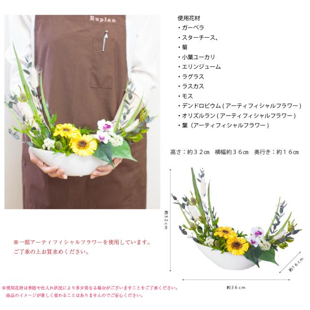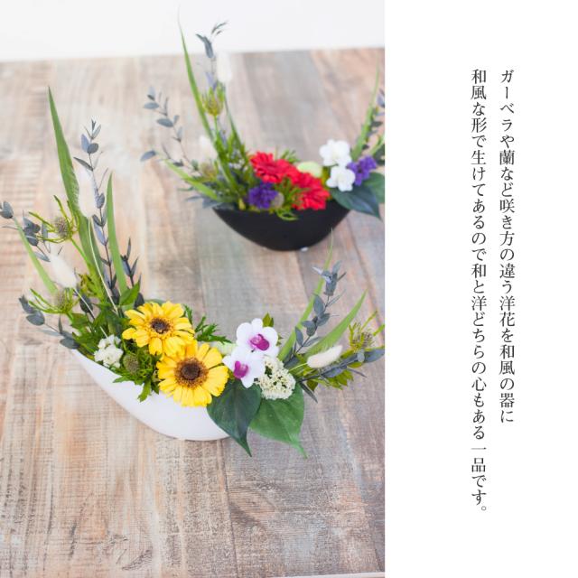 月の形の和風のアレンジメントです。舟形の器に逆らうことなく自然に堂々と生けました。 はっきりとした色合いの花々を幅広く使用している見栄えある一品です。