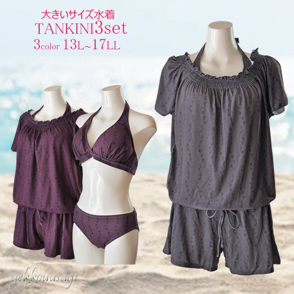 体型カバー タンキニ ビキニ 3点セット 大きいサイズ限定 TROPICAL BEACH(トロピカルビーチ)キュートな小花柄 ホルターネックビキニ&ロンパース水着 283(au2f)