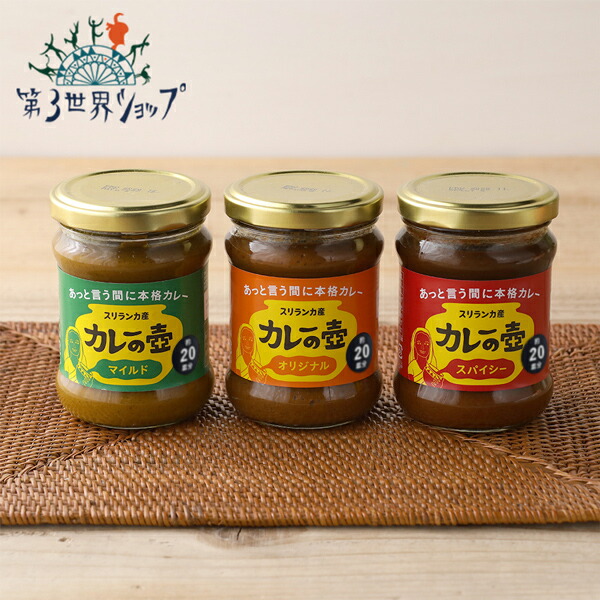20分で本格カレー!魔法のスパイス調味料。第3世界ショップ カレーの壺 (マイルド・オリジナル・スパイシー)キャッチ—なラベルの「カレーの壺」はたっぷりのスパイスと野菜の旨みがギュッと詰まったペースト状の「万能カレー調味料」。 |