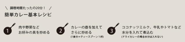 その2.早い!簡単!20分でスパイス香る本格カレー 時間をかけて煮込む欧風カレーと違い、「カレーの壺」で作るスパイスカレーは煮込んだり寝かせる必要はありません。炒めた具材にからめササッと火を通すだけ。手早く調理して、出来たての味とスパイスの豊かな香りを楽しむのが特徴です。 「カレーの壺」にはたっぷりの旨味がギュッと凝縮されているので、カレー1食分を作るのに必要な量はティースプーン1杯(約10g)でOK。カレーなら1瓶で20皿分も作れます。 |