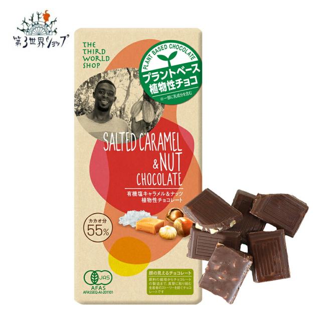 塩キャラメル&ナッツ 植物性チョコレート | フェアトレード 第3世界ショップでは、地域や社会の問題点を見つけ、「解」となる新しい社会システムを日々提案しています。 | 「顔の見える」原材料 使用している原材料には、どこで、誰が、どのように作ったかが分かる『顔の見える』ものを厳選して使用しています。