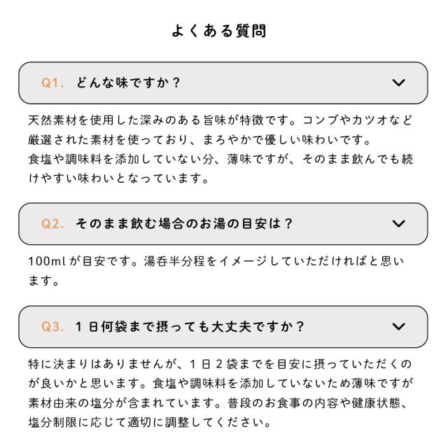まずはシンプルに「飲むお出汁」として、お出汁1袋を100mlのお湯に溶かしてそのままお召し上がりください。お好みで塩昆布や梅干し、大根おろしや生姜などを加えて、アレンジも無限に楽しめます。