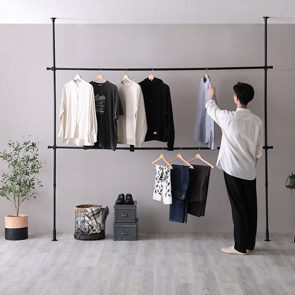 スペースを有効活用 広々整理 収納 できる2段式伸縮ハンガーラック、幅250cmのシックなブラックカラーがお部屋をスタイリッシュに演出 黒 スペースを有効活用 広々整理 収納 できる2段式伸縮ハンガーラック、幅250cmのシックなブラックカラーがお部屋をスタイリッシュに演出