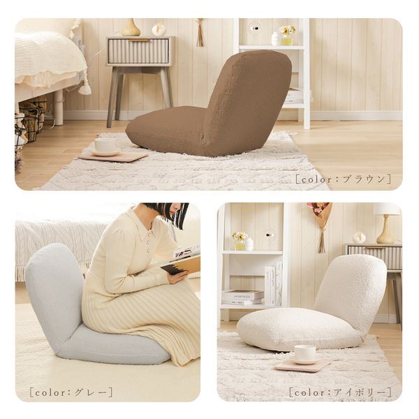 厚みのある座面で座り心地抜群。生地はモコモコした質感生地を使用しています。背もたれは14段階リクライングでお好みの姿勢でくつろげます。