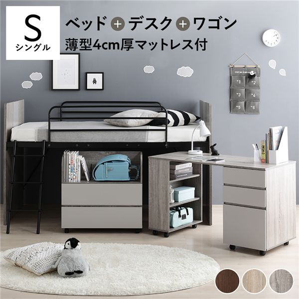 シングルベッド グレー 灰色 システムベッド 3点セット + マットレス付き ベッド幅102cm グレー 灰色 ロフトベッド 学習机 デスクワゴン 子供部屋 送料無料