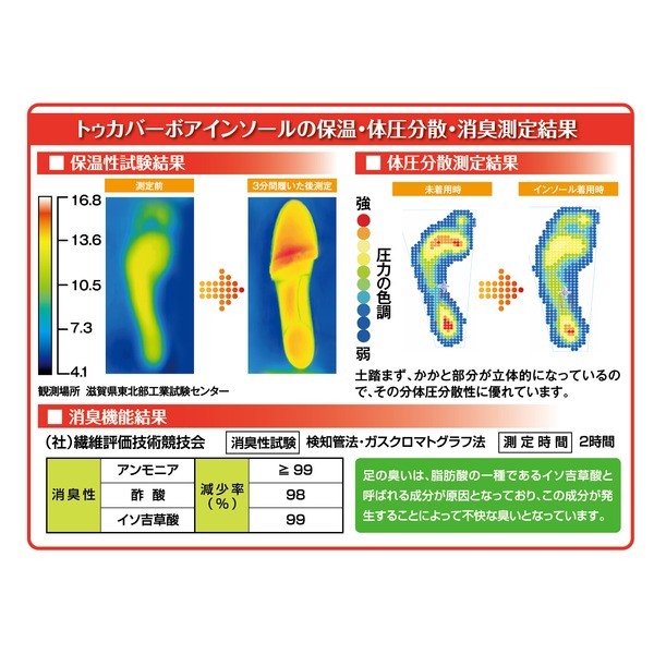 インソール本体の素材に消臭機能があり、アンモニアや脂肪酸の一種であるイソ吉草酸の吸収性があります。
