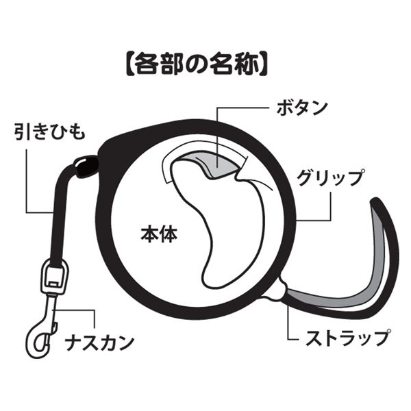 シンプル、コンパクトな新構造、従来品より約3cm小さく、厚みは約1.7cmスリムに。パーツ点数も30%削減の新設計。引きひもをグリップの中に巻き取る全く新しい構造だから、重心がハンドルにより近付けることができたため、しっかり握れる。軽く感じ、使いやすく、引張る力にも安定感があり、女性でも使いやすい新感覚の使用感の散歩用伸縮リード。