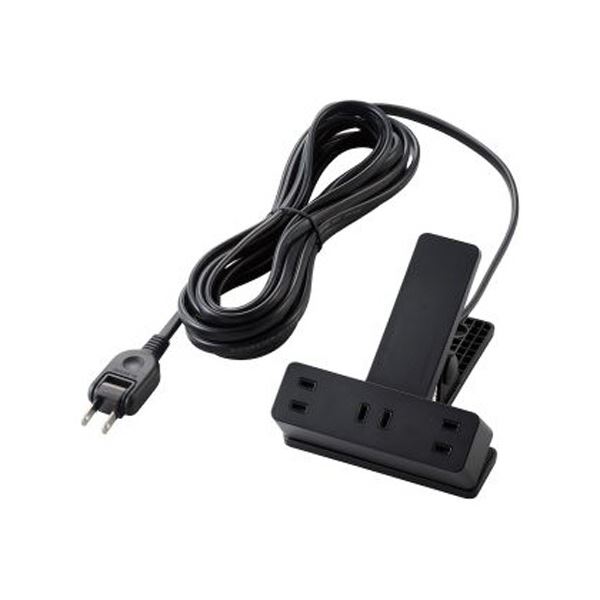 ●机などに挟んで利用することができるクリップ機構を搭載したブラックの2ピン式の3個口タップ。コードの長さは5mです。