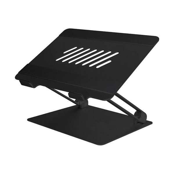 ●17型までノートパソコン・タブレットに対応した折り畳みアルミスタンド「OWL-PCST01」シリーズ、カラーはブラックです。