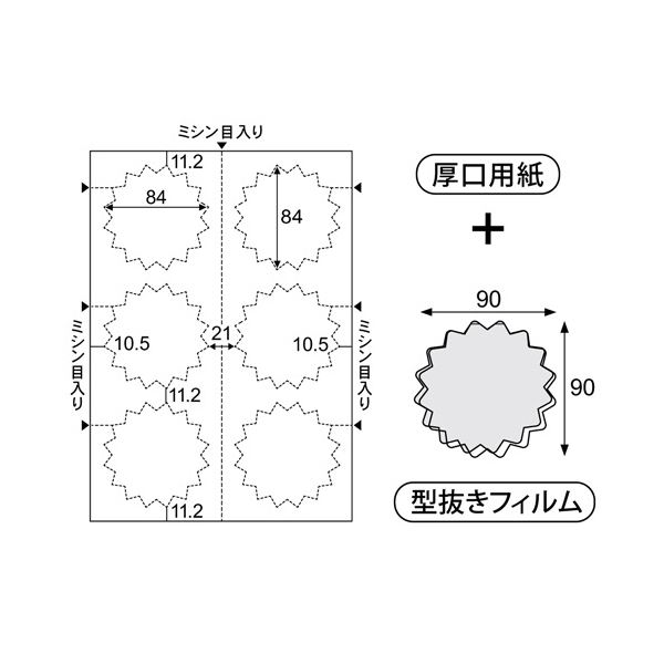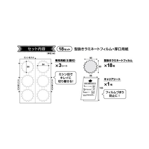 ●専用の厚口用紙に印刷して、フィルムに挟んでラミネートするだけでオリジナルのギザギザPOPが簡単に作成できます。