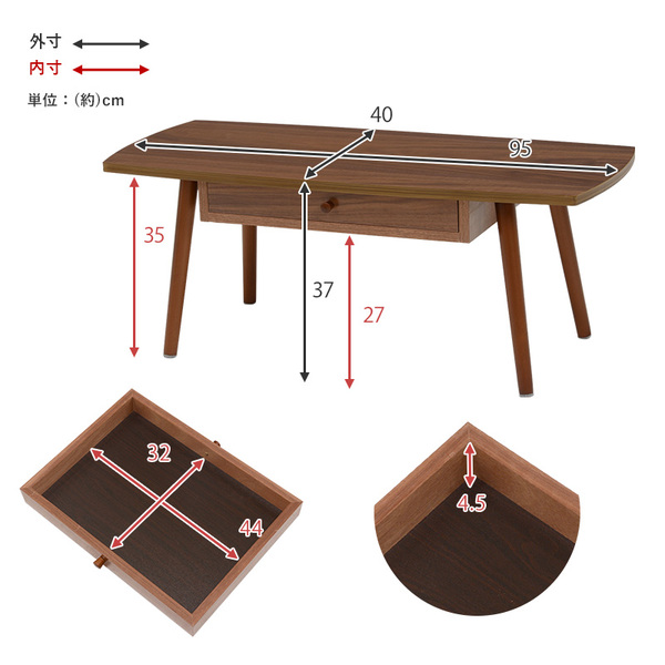 商品仕様: センターテーブル ローテーブル 約幅95×奥行40×高さ37cm ホワイト 白ウォッシュ スクエア型 引き出し 木製脚付 お客様組立品 リビング
