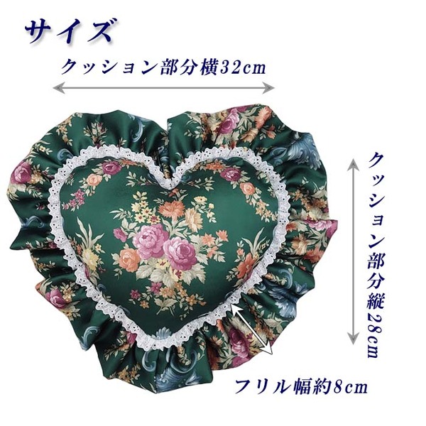 商品仕様: クッション ハート ダブルフリル 【グリーン 緑 ローズガーデン】 中身付き 花柄 日本製 女性