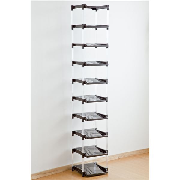 靴を最大10足収納できる、便利なシューズラック 10段。毎日散らかってしまう玄関まわりをスッキリ収納できます。また、会社のオフィス関連・工場などシューズラックとして様々なシーンでお使いいただけます。支柱部分は透明で丈夫なポリスチレン材を使用しているので、強度があり高級感を演出します。棚板がプラスチック製なので、お手入れもカンタンです。シューズラックの段数を分割して使用することもかのうです。(例として6段と4段など)また、お気に入りの靴を飾ってコレクションシューズラックとしてもお使いいただけます。