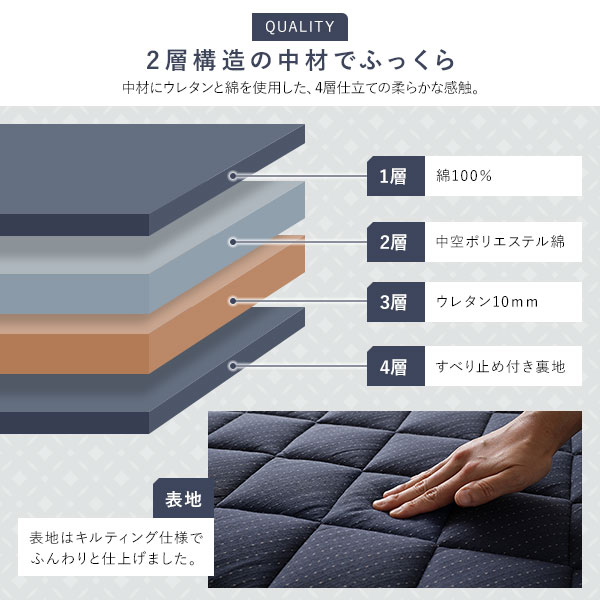 中材にウレタンと綿を使用した、4層仕立ての柔らかな感触。
