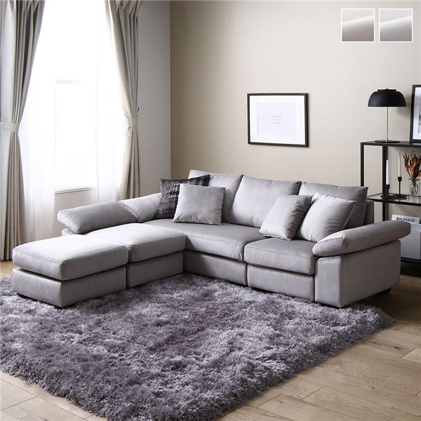 カウチソファ 〔 脚付き ロー脚6cm ファブリック グレー 〕 ミニクッション3個付き カバーリング仕様 ベルベット調 お客様組立品 送料無料