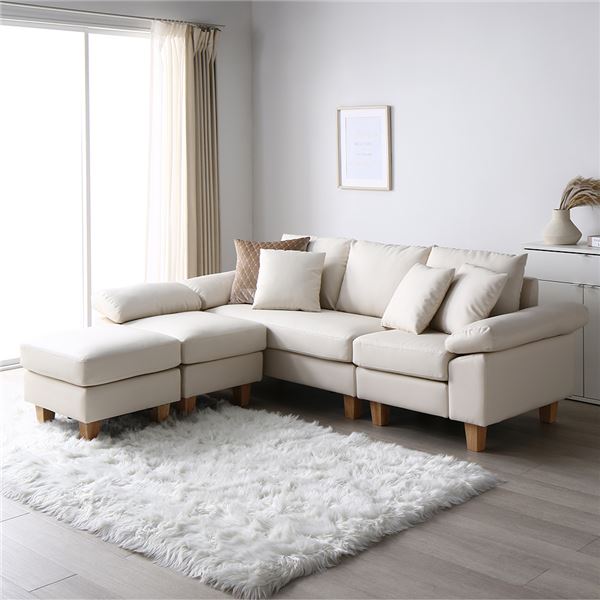 商品仕様: カウチソファ 〔 脚付き 木脚12cm レザー アイボリー 乳白色 〕 PVC生地 ポケットコイル ミニクッション3個付き お客様組立品