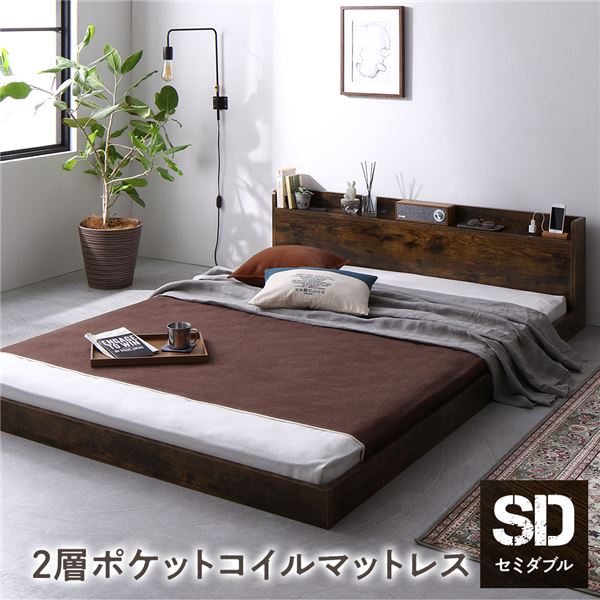 セミダブルベッド ベッド 2層ポケットコイルマットレス付き ヴィンテージブラウン 低床 棚付き 宮付き コンセント付き すのこ ローベッド お客様組立品