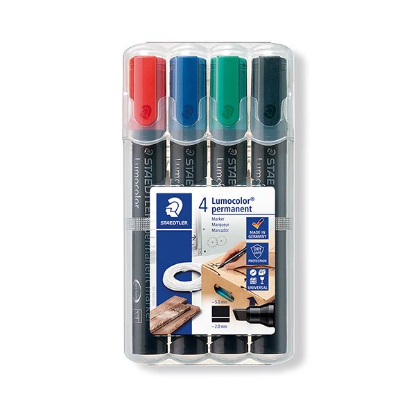 鮮やかな色彩で力強い筆跡を描く4色の斧型油性マーカーが1セットになったルモカラー太書き 幅広い用途に対応し、書く楽しさを倍増させる5パックセット プロも愛用するパフォーマンス満点のマーカーで、アートや手書きの世界を彩ろう ステッドラー 油性マーカー ルモカラー太書き斧型 B(2.0~5.0mm) 4色(各色1本) 350 WP4 1セット(5パック)