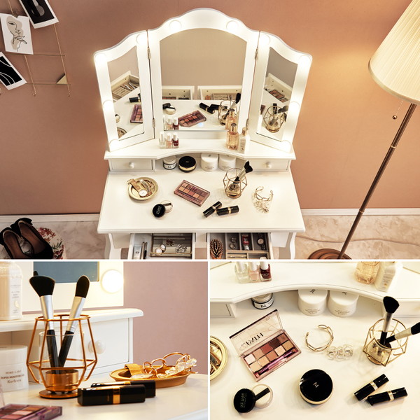 LEDの女優ライト付きのドレッサー。いろいろな角度からメイクやヘアスタイルを確認できる三面鏡タイプ。上品な曲線脚のデザインを合わせたスツール付き