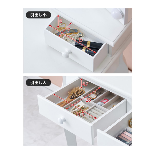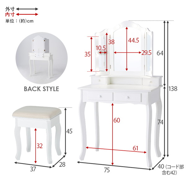 ■サイズ(約)ドレッサー:幅75×奥行42×高さ138cm、スツール:幅37×奥行28×高さ45cm