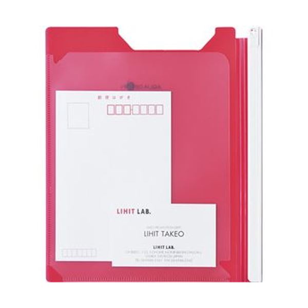 ●ハガキや名刺等が入る透明ポケット付、赤のクリップファイル。